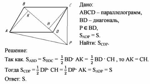 Для того чтобы дать полноценный ответ, был привлечен специалист, который хорошо разбирается требуемой тематике "ЕГЭ (школьный)". Ваш вопрос звучал следующим образом: В параллелограмме ABCD на продолжении диагонали BD за точку D взята точка Р. Площадь треугольника ADP равна S. Чему равна площадь треугольника CDP?
