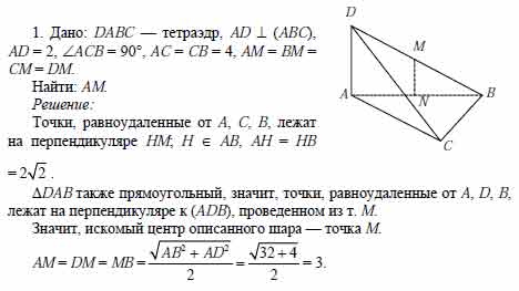Для того чтобы дать полноценный ответ, был привлечен специалист, который хорошо разбирается требуемой тематике "ЕГЭ (школьный)". Ваш вопрос звучал следующим образом: В тетраэдре DABC AD ⊥ ABC, AD = 2, ∠ ACB = 90°, AC = CB = 4. Точка М равноудалена от всех вершин тетраэдра. Найдите расстояния от этой точки до вершин тетраэдра.