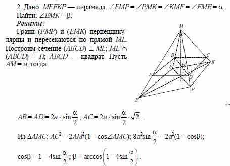 Для того чтобы дать полноценный ответ, был привлечен специалист, который хорошо разбирается требуемой тематике "ЕГЭ (школьный)". Ваш вопрос звучал следующим образом: В пирамиде MEFKP плоские углы при вершине М равны а. Вычислите угол β при вершине диагонального сечения ЕМК.