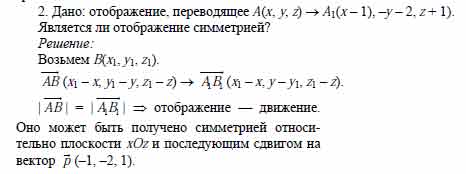 Для того чтобы дать полноценный ответ, был привлечен специалист, который хорошо разбирается требуемой тематике "ЕГЭ (школьный)". Ваш вопрос звучал следующим образом: Является ли движением отображение пространства на себя, при котором любая точка с координатами (х; y; z) переходит в точку (x - 1; -y - 2; z + 1)? Если да, то каким образом может быть получена такая точка?
