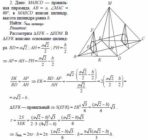 Для того чтобы дать полноценный ответ, был привлечен специалист, который хорошо разбирается требуемой тематике "ЕГЭ (школьный)". Ваш вопрос звучал следующим образом: Сторона основания правильной четырехугольной пирамиды равна а. Боковые ребра наклонены к плоскости основания под углом 60°. В эту пирамиду вписан цилиндр, боковая поверхность которого касается основания пирамиды, а окружности оснований — боковых граней, причем образующая цилиндра расположена на диагонали основания. Найдите площадь боковой поверхности цилиндра, если его высота равна h.