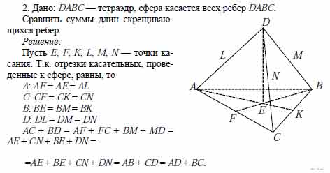 Для того чтобы дать полноценный ответ, был привлечен специалист, который хорошо разбирается требуемой тематике "ЕГЭ (школьный)". Ваш вопрос звучал следующим образом: Шар касается всех ребер тетраэдра. Сравните суммы длин скрещивающихся ребер тетраэдра.