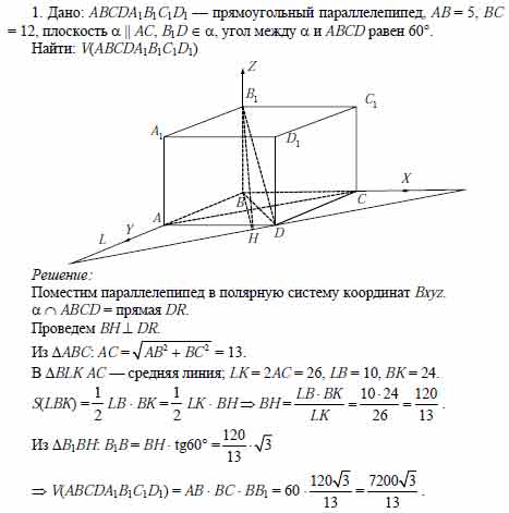 Для того чтобы дать полноценный ответ, был привлечен специалист, который хорошо разбирается требуемой тематике "ЕГЭ (школьный)". Ваш вопрос звучал следующим образом: В прямоугольном параллелепипеде ABCDA1B1C1D1 АВ = 5, ВС = 12. Через диагональ параллелепипеда B1D параллельно диагонали основания АС проведена плоскость, составляющая с плоскостью основания угол в 60°. Найдите объем параллелепипеда