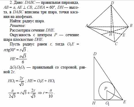 Для того чтобы дать полноценный ответ, был привлечен специалист, который хорошо разбирается требуемой тематике "ЕГЭ (школьный)". Ваш вопрос звучал следующим образом: Сторона основания правильной треугольной пирамиды равна а, двугранный угол при основании пирамиды 60°. В пирамиду вписаны три равных шара, каждый из которых касается двух других шаров, плоскости основания и одной из боковых граней пирамиды. Зная, что точки касания шаров с основанием лежат на апофемах основания, найдите радиус шара.
