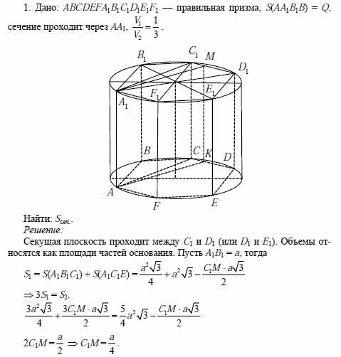 Для того чтобы дать полноценный ответ, был привлечен специалист, который хорошо разбирается требуемой тематике "ЕГЭ (школьный)". Ваш вопрос звучал следующим образом: Площадь боковой грани правильной шестиугольной призмы равна Q. Через боковое ребро проведено сечение, которое разделило призму на части, объемы которых относятся как 1:3. Найдите площадь сечения.