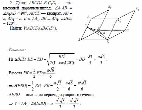 Для того чтобы дать полноценный ответ, был привлечен специалист, который хорошо разбирается требуемой тематике "ЕГЭ (школьный)". Ваш вопрос звучал следующим образом: Основанием наклонного параллелепипеда ABCDA1B1C1D1 служит квадрат со стороной, равной а. Боковые ребра тоже равны a, ∠A1AD = ∠A1AB < 90°. Двугранный угол при ребре АА1 равен 120°. Найдите объем параллелепипеда.