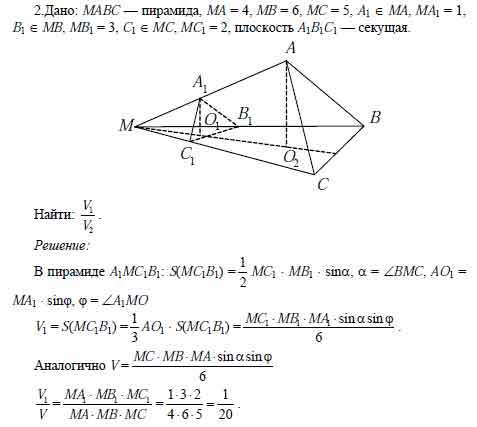 Для того чтобы дать полноценный ответ, был привлечен специалист, который хорошо разбирается требуемой тематике "ЕГЭ (школьный)". Ваш вопрос звучал следующим образом: В треугольной пирамиде МАВС МА = 4, MB = 6, МС = 5. На ребрах МА,MB и МС выбраны точки А1, В1 и С1 так, что МА1 - 1, МВ1 = 3 и МС1 = 2. В каком отношении плоскость A1B1C1 разделила объем пирамиды?