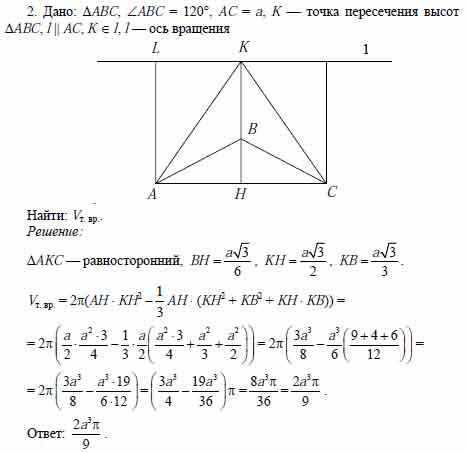 Для того чтобы дать полноценный ответ, был привлечен специалист, который хорошо разбирается требуемой тематике "ЕГЭ (школьный)". Ваш вопрос звучал следующим образом: В равнобедренном треугольнике угол при вершине равен 120°, а основание равно а. Этот треугольник вращается вокруг оси, проходящей через точку пересечения высот треугольника и параллельной основанию этого треугольника. Найдите объем тела вращения.