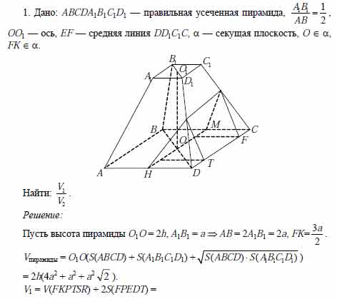 Для того чтобы дать полноценный ответ, был привлечен специалист, который хорошо разбирается требуемой тематике "ЕГЭ (школьный)". Ваш вопрос звучал следующим образом: Стороны оснований правильной четырехугольной усеченной пирамиды относятся как 1:2. Через центр нижнего основания и среднюю линию одной из боковых граней проведена плоскость. В каком отношении эта плоскость разделила объем пирамиды?