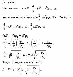 Дано: полый металлический шар, внешний радиус которого R, плавает, будучи на половину погруженным в воду. Плотность материала ρш.