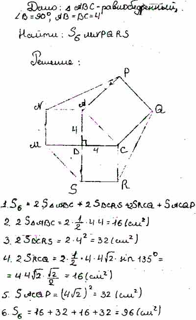 Для того чтобы дать полноценный ответ, был привлечен специалист, который хорошо разбирается требуемой тематике "ЕГЭ (школьный)". Ваш вопрос звучал следующим образом: Катет равнобедренного прямоугольного треугольника равен 4 см. На сторонах треугольника во внешнюю сторону построены квадраты. Найдите площадь шестиугольника, вершинами которого являются вершины квадратов, не принадлежащих данному треугольнику.
