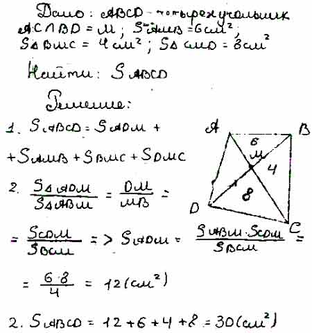 Для того чтобы дать полноценный ответ, был привлечен специалист, который хорошо разбирается требуемой тематике "ЕГЭ (школьный)". Ваш вопрос звучал следующим образом: Диагонали выпуклого четырёхугольника ABCD пересекаются в точке М Площади треугольников АМВ, ВМС и CMD соответственно равны 6 см2, 4 см2 и 8 см2. Найдите площадь четырёхугольника ABCD