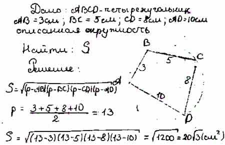 Для того чтобы дать полноценный ответ, был привлечен специалист, который хорошо разбирается требуемой тематике "ЕГЭ (школьный)". Ваш вопрос звучал следующим образом: В окружность вписан четырёхугольник, стороны которого последовательно равны 3 см, 5 см, 8 см и 10 см. Найдите площадь четырёхугольника.