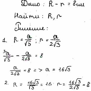 Для того чтобы дать полноценный ответ, был привлечен специалист, который хорошо разбирается требуемой тематике "ЕГЭ (школьный)". Ваш вопрос звучал следующим образом: Найдите радиусы описанной около правильного треугольника и вписанной в него окружностей, если их разность равна 8 см