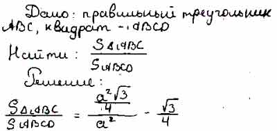 Для того чтобы дать полноценный ответ, был привлечен специалист, который хорошо разбирается требуемой тематике "ЕГЭ (школьный)". Ваш вопрос звучал следующим образом: Найдите отношение площадей правильных треугольника и четырехугольника стороны которых равны.