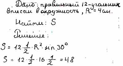Для того чтобы дать полноценный ответ, был привлечен специалист, который хорошо разбирается требуемой тематике "ЕГЭ (школьный)". Ваш вопрос звучал следующим образом: Найдите площадь правильного двенадцатиугольника вписанного в окружность, радиус которой равен 4 см