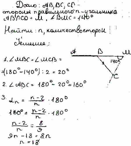 Для того чтобы дать полноценный ответ, был привлечен специалист, который хорошо разбирается требуемой тематике "ЕГЭ (школьный)". Ваш вопрос звучал следующим образом: Отрезки АВ, ВС и CD — три последовательные стороны правильного многоугольника. Продолжения сторон АВ и CD пересекаются в точке М ВМС = 140°, Найдите количество сторон данного правильного многоугольника.