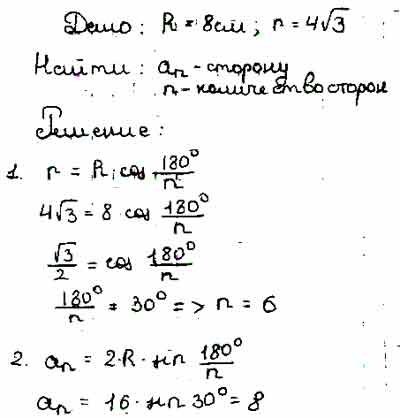 Для того чтобы дать полноценный ответ, был привлечен специалист, который хорошо разбирается требуемой тематике "ЕГЭ (школьный)". Ваш вопрос звучал следующим образом: Радиус окружности, описанной около правильного многоугольника, равен 8 см, а радиус окружности, вписанной в него, — 4√3 см. Найдите сторону многоугольника и количество его сторон,