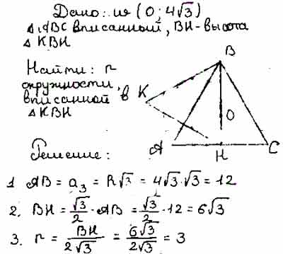 Для того чтобы дать полноценный ответ, был привлечен специалист, который хорошо разбирается требуемой тематике "ЕГЭ (школьный)". Ваш вопрос звучал следующим образом: В окружность радиуса 4√3 см вписан правильный треугольник. На его высоте как на стороне построен другой правильный треугольник, и в него вписана окружность. Найдите радиус этой окружности