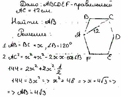 Для того чтобы дать полноценный ответ, был привлечен специалист, который хорошо разбирается требуемой тематике "ЕГЭ (школьный)". Ваш вопрос звучал следующим образом: Найдите сторону правильного шестиугольника ABCDEF,если его диагональ АС равна 12 см