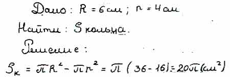 Для того чтобы дать полноценный ответ, был привлечен специалист, который хорошо разбирается требуемой тематике "ЕГЭ (школьный)". Ваш вопрос звучал следующим образом: Найдите площадь кольца, расположенного между двумя окружностями, имеющими общий центр, радиусы которых равны 4 см и 6 см
