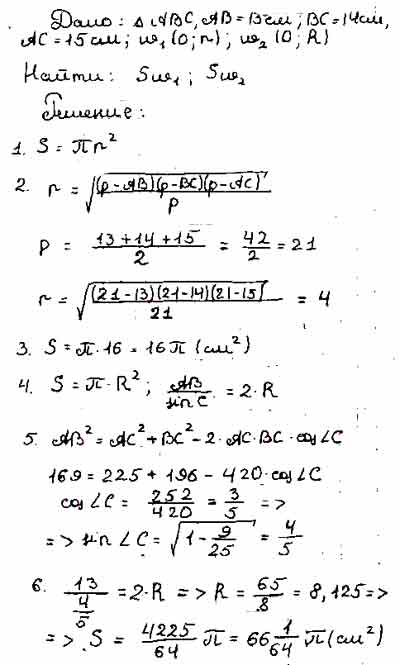 Для того чтобы дать полноценный ответ, был привлечен специалист, который хорошо разбирается требуемой тематике "ЕГЭ (школьный)". Ваш вопрос звучал следующим образом: Стороны треугольника равны 13 см, 14 см и 15 см. Найдите площади описанного около него и вписанного в него кругов