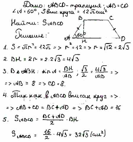 Для того чтобы дать полноценный ответ, был привлечен специалист, который хорошо разбирается требуемой тематике "ЕГЭ (школьный)". Ваш вопрос звучал следующим образом: Площадь круга, вписанного в равнобокую трапецию, равна 12п см2, а угол трапеции равен 60 Найдите площадь трапеции