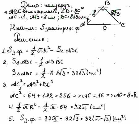 Для того чтобы дать полноценный ответ, был привлечен специалист, который хорошо разбирается требуемой тематике "ЕГЭ (школьный)". Ваш вопрос звучал следующим образом: В полукруг вписан прямоугольный треугольник, гипотенуза которого совпадает с диаметром полукруга, а катеты равны 8 см и 8√3 см. Найдите площадь части полукруга, расположенной вне треугольника.