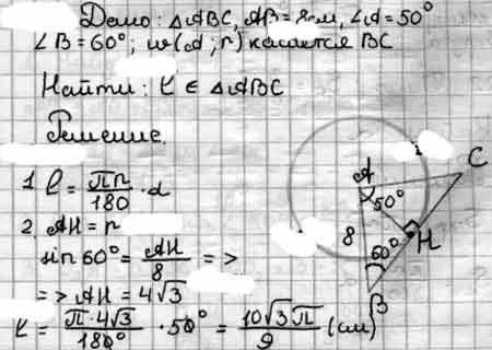 Для того чтобы дать полноценный ответ, был привлечен специалист, который хорошо разбирается требуемой тематике "ЕГЭ (школьный)". Ваш вопрос звучал следующим образом: В треугольнике ABC AB = 8 см, A = 50 B = 60 Окружность с центром А касается стороны ВС. Найдите длину дуги этой окружности, принадлежащей треугольнику