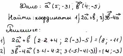 Для того чтобы дать полноценный ответ, был привлечен специалист, который хорошо разбирается требуемой тематике "ЕГЭ (школьный)". Ваш вопрос звучал следующим образом: Даны векторы а (2; -3) и b4; -5). Найдите координаты вектора: 1) 2а + b; 2) 3b-4а.