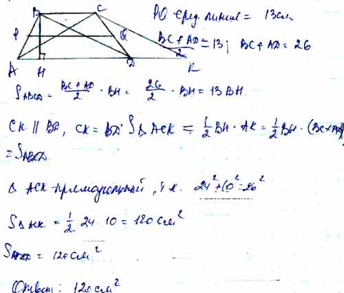 Для того чтобы дать полноценный ответ, был привлечен специалист, который хорошо разбирается требуемой тематике "ЕГЭ (школьный)". Ваш вопрос звучал следующим образом: Диагонали трапеции равны 10 см и 24 см, а средняя линия равна 13 см. Найдите площадь трапеции.