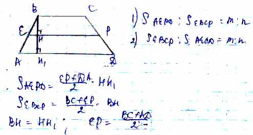 Для того чтобы дать полноценный ответ, был привлечен специалист, который хорошо разбирается требуемой тематике "ЕГЭ (школьный)". Ваш вопрос звучал следующим образом: Средняя линия трапеции разбивает ее на две трапеции, площади которых относятся как m : n. Найдите отношение оснований трапеции