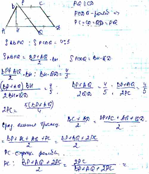 Для того чтобы дать полноценный ответ, был привлечен специалист, который хорошо разбирается требуемой тематике "ЕГЭ (школьный)". Ваш вопрос звучал следующим образом: Прямая, параллельная боковой стороне трапеции, отсекает от нее ромб. Площади полученных фигур относятся как 4:5. Найдите отношение стороны ромба к средней линии трапеции.
