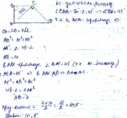 Для того чтобы дать полноценный ответ, был привлечен специалист, который хорошо разбирается требуемой тематике "ЕГЭ (школьный)". Ваш вопрос звучал следующим образом: В прямоугольной трапеции ABCD (AD - большее основание) диагональ АС является биссектрисой угла А и перпендикулярна боковой стороне CD. Найдите длину средней линии трапеции, если АС = 7√2 .