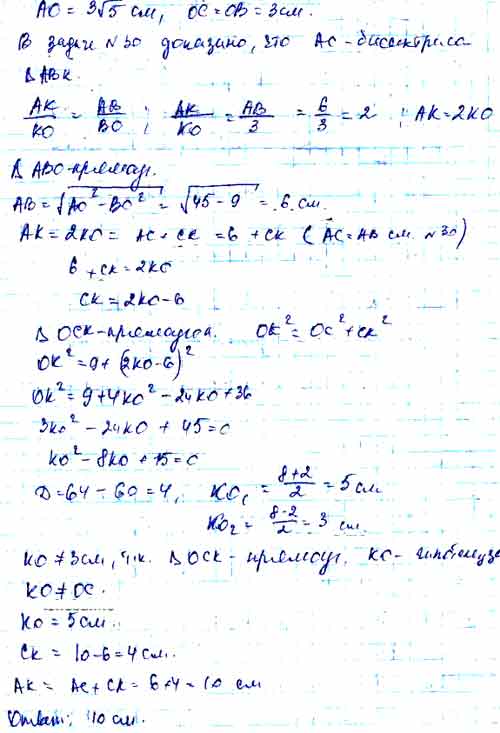 Для того чтобы дать полноценный ответ, был привлечен специалист, который хорошо разбирается требуемой тематике "ЕГЭ (школьный)". Ваш вопрос звучал следующим образом: Окружность с центром в точке О касается сторон угла А в точках B и С. Прямая ВО пересекает луч АС в точке К. Найдите длину отрезка АК, если АО = 3√5 cm, a радиус окружности равен 3 см.