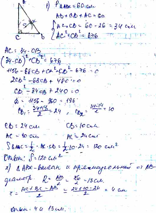 Для того чтобы дать полноценный ответ, был привлечен специалист, который хорошо разбирается требуемой тематике "ЕГЭ (школьный)". Ваш вопрос звучал следующим образом: Периметр прямоугольного треугольника равен 60 см, а гипотенуза равна 26 см. Найдите: 1) площадь треугольника; 2) радиусы вписанной в треугольник и описанной около треугольника окружностей.