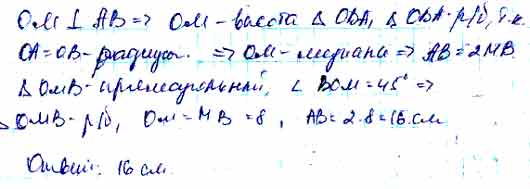 Для того чтобы дать полноценный ответ, был привлечен специалист, который хорошо разбирается требуемой тематике "ЕГЭ (школьный)". Ваш вопрос звучал следующим образом: Из центра О окружности к хорде АВ проведен перпендикуляр ОМ, равный 8 см. Найдите хорду АВ, если ∠BOM = 45°.