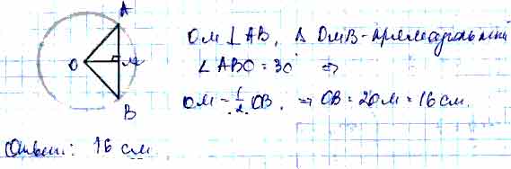 Для того чтобы дать полноценный ответ, был привлечен специалист, который хорошо разбирается требуемой тематике "ЕГЭ (школьный)". Ваш вопрос звучал следующим образом: Из центра окружности к хорде АВ проведен перпендикуляр ОМ, равный 8 см. Найдите радиус окружности, если ∠ABO = 30°.