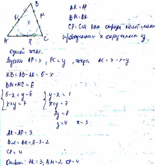 Для того чтобы дать полноценный ответ, был привлечен специалист, который хорошо разбирается требуемой тематике "ЕГЭ (школьный)". Ваш вопрос звучал следующим образом: В треугольнике ABC известны стороны АВ = 5, ВС = 6, АС = 7. Окружность, вписанная в треугольник, касается его сторон АВ, ВС, АС соответственно в точках К, М, Р. Найдите длины отрезков АК, ВЫ, СР.