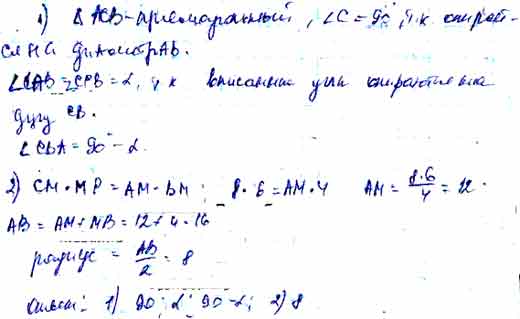 Для того чтобы дать полноценный ответ, был привлечен специалист, который хорошо разбирается требуемой тематике "ЕГЭ (школьный)". Ваш вопрос звучал следующим образом: В окружности проведены хорда СР и диаметр АВ Найдите: 1) углы треугольника ABC, если Р = а; 2) радиус окружности, если РМ = 6, СМ = 8, ВМ = 4.