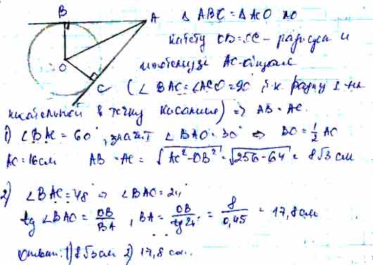 Для того чтобы дать полноценный ответ, был привлечен специалист, который хорошо разбирается требуемой тематике "ЕГЭ (школьный)". Ваш вопрос звучал следующим образом: Прямые АВ и АС касаются окружности с центром О радиусом 8 см, Б и С — точки касания. Найдите отрезки АВ и АС, если: 1) ∠BAC = 60°; 2) ∠ВАС = 48°.