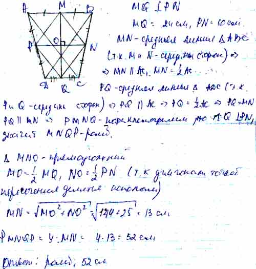 Для того чтобы дать полноценный ответ, был привлечен специалист, который хорошо разбирается требуемой тематике "ЕГЭ (школьный)". Ваш вопрос звучал следующим образом: Отрезки, соединяющие середины противоположных сторон выпуклого четырехугольника, перпендикулярны и равны 24 см и 10 см. Определите вид четырехугольника с вершинами в серединах сторон данного четырехугольника и найдите его периметр.