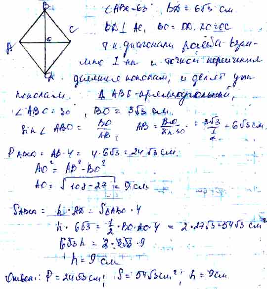 Для того чтобы дать полноценный ответ, был привлечен специалист, который хорошо разбирается требуемой тематике "ЕГЭ (школьный)". Ваш вопрос звучал следующим образом: В ромбе угол равен 60°, диагональ, проведенная из вершины этого угла, равна 6√3 см. Найдите периметр, площадь и высоту ромба.