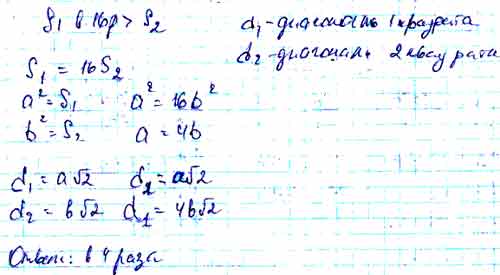 Для того чтобы дать полноценный ответ, был привлечен специалист, который хорошо разбирается требуемой тематике "ЕГЭ (школьный)". Ваш вопрос звучал следующим образом: Площадь одного квадрата в 16 раз больше площади другого. Во сколько раз диагональ первого квадрата больше диагонали второго квадрата?