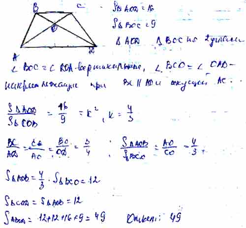 Для того чтобы дать полноценный ответ, был привлечен специалист, который хорошо разбирается требуемой тематике "ЕГЭ (школьный)". Ваш вопрос звучал следующим образом: Известно, что в трапеции ABCD (ВС и AD — основания) площади треугольников AOD и ВОС равны соответственно 16 и 9 (О — точка пересечения диагоналей). Найдите площадь трапеции.