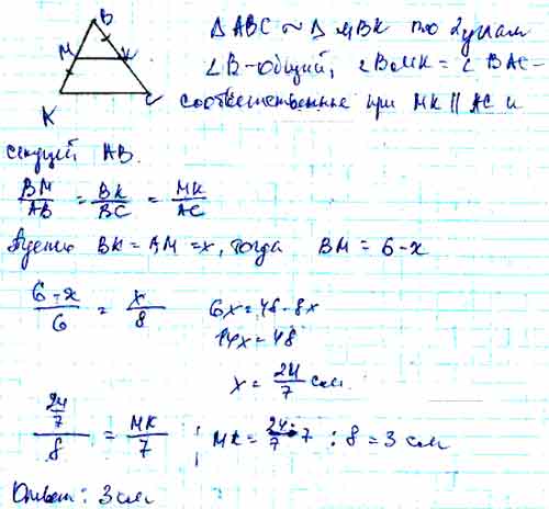 Для того чтобы дать полноценный ответ, был привлечен специалист, который хорошо разбирается требуемой тематике "ЕГЭ (школьный)". Ваш вопрос звучал следующим образом: В треугольнике ABC со сторонами АВ = 6, АС = 7, ВС = 8 на АВ взята точка М и проведена прямая МК (К е ВС), параллельная стороне АС, так, что AM = ВК. Найдите длину МК.