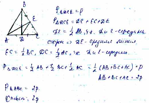 Для того чтобы дать полноценный ответ, был привлечен специалист, который хорошо разбирается требуемой тематике "ЕГЭ (школьный)". Ваш вопрос звучал следующим образом: В треугольнике ABC проведены медианы АЕ и BD. Найдите периметр треугольника ABC, если периметр треугольника ВСЕ равен р.