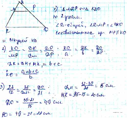 Для того чтобы дать полноценный ответ, был привлечен специалист, который хорошо разбирается требуемой тематике "ЕГЭ (школьный)". Ваш вопрос звучал следующим образом: Дана трапеция КМРО (МР — меньшее основание). Боковые стороны продолжены до пересечения в точке D. 1) Укажите полученные при этом подобные треугольники. Докажите их подобие. 2) Найдите большее основание, если МР = a, DM = b, МК = с. 3) Найдите боковые стороны трапеции, если МР = 12 см, КО = 28 см, DK = 35 см, DP = 21 см.