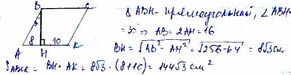 Для того чтобы дать полноценный ответ, был привлечен специалист, который хорошо разбирается требуемой тематике "ЕГЭ (школьный)". Ваш вопрос звучал следующим образом: В параллелограмме АВСК проведен перпендикуляр ВН к стороне АK, при этом точка Н лежит на стороне АК. Найдите площадь параллелограмма, если известно, что АН = 8 см, НК = 10 см, угол АВН равен 30°.
