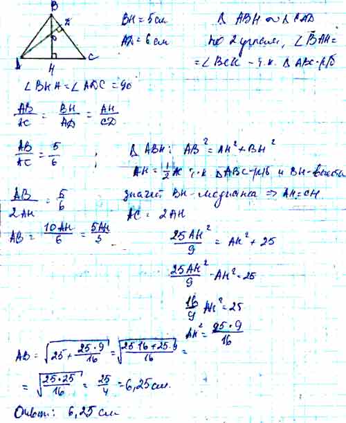 Для того чтобы дать полноценный ответ, был привлечен специалист, который хорошо разбирается требуемой тематике "ЕГЭ (школьный)". Ваш вопрос звучал следующим образом: В равнобедренном треугольнике высоты, проведенные к основанию и боковой стороне, равны соответственно 5 см и б см. Найдите длину боковой стороны.